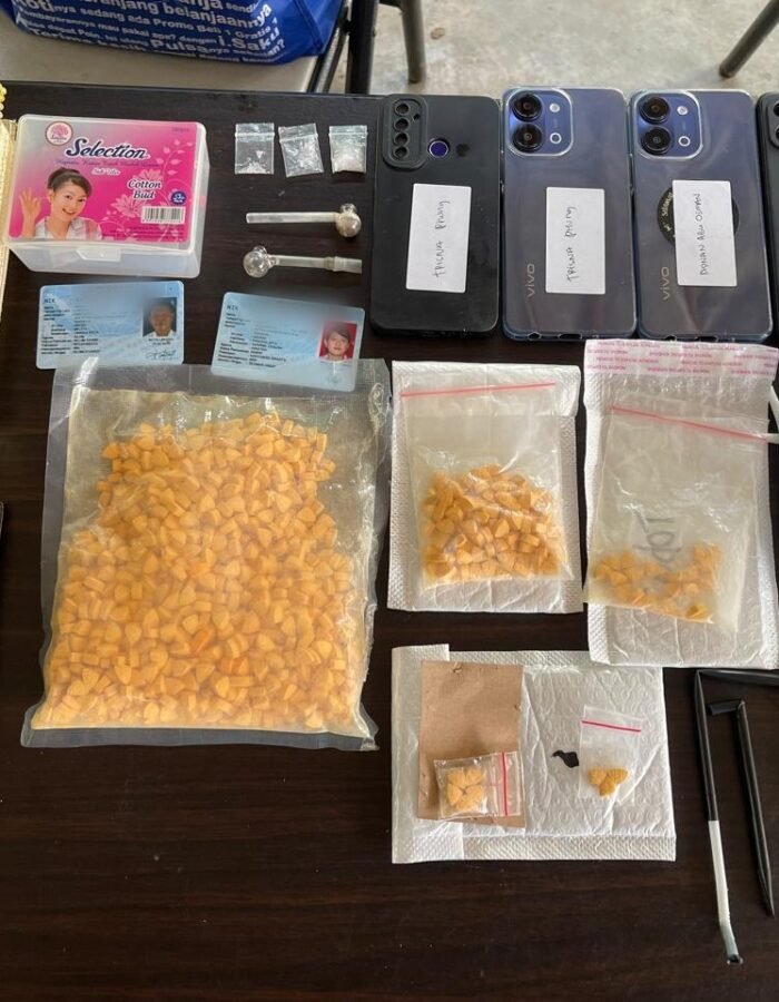 Dari hasil penggeledahan, petugas menemukan barang bukti berupa 1.013 butir pil ekstasi seberat 343 gram, tiga paket sabu seberat 1,27 gram, alat hisap, beberapa unit handphone, serta buku catatan yang diduga terkait transaksi narkotika.