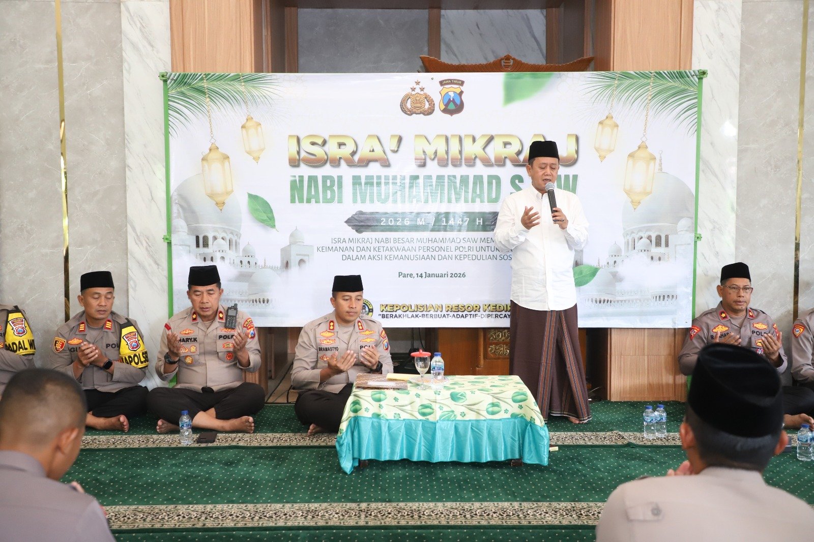 Peringatan Isra’ Mi’raj ini dihadiri langsung Kapolres Kediri AKBP Bramastyo Priaji, S.H., S.I.K., M.Si., bersama Ketua Bhayangkari Cabang Kediri, Wakapolres Kediri Kompol Hari Kurniawan, S.H., M.H., beserta Wakil Ketua Bhayangkari Ranting, para Pejabat Utama (PJU), Kapolsek jajaran, perwakilan pengurus Bhayangkari Cabang Kediri, serta diikuti seluruh personel Polres Kediri.