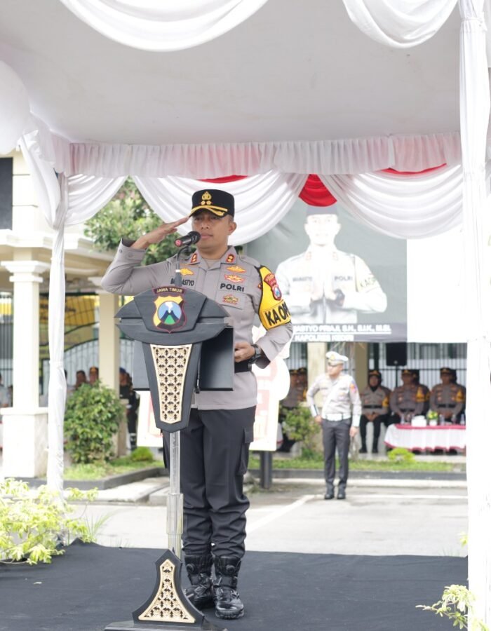 Saat membacakan amanat Kapolda Jawa Timur Irjen Pol Drs. Nanang Avianto, M.Si., Kapolres Kediri menyampaikan apresiasi kepada seluruh unsur yang selama ini mendukung upaya keselamatan berlalu lintas.