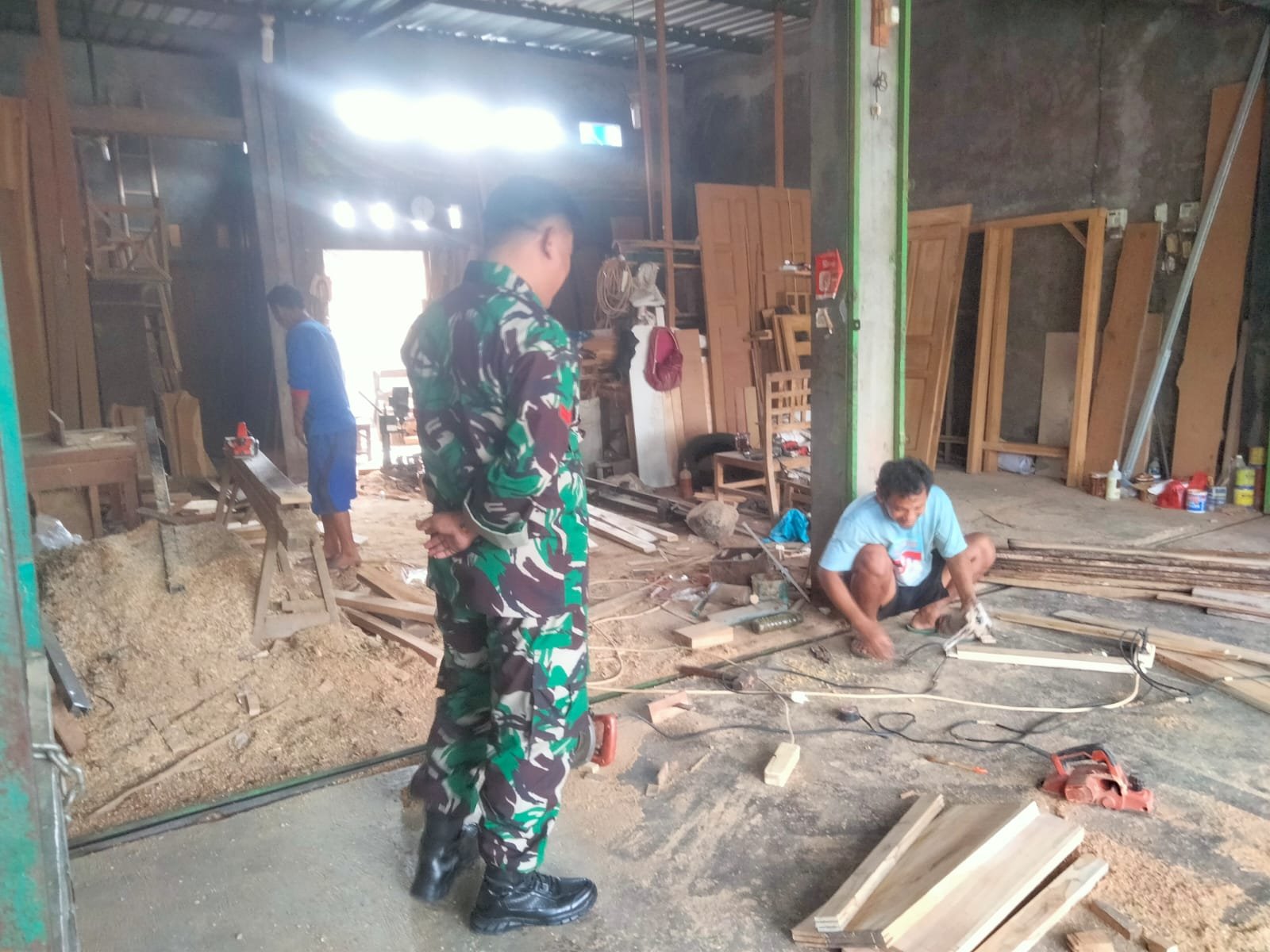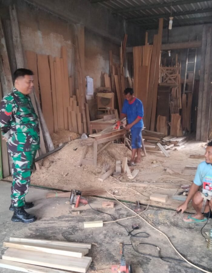 Dalam kegiatan tersebut, Babinsa menyambangi salah satu warga yang tengah beraktivitas di bengkel pengolahan kayu. Suasana hangat dan penuh keakraban tampak saat Babinsa berdialog langsung, mendengarkan aspirasi serta memberikan motivasi kepada warga agar tetap semangat dalam menjalankan usaha sehari-hari.