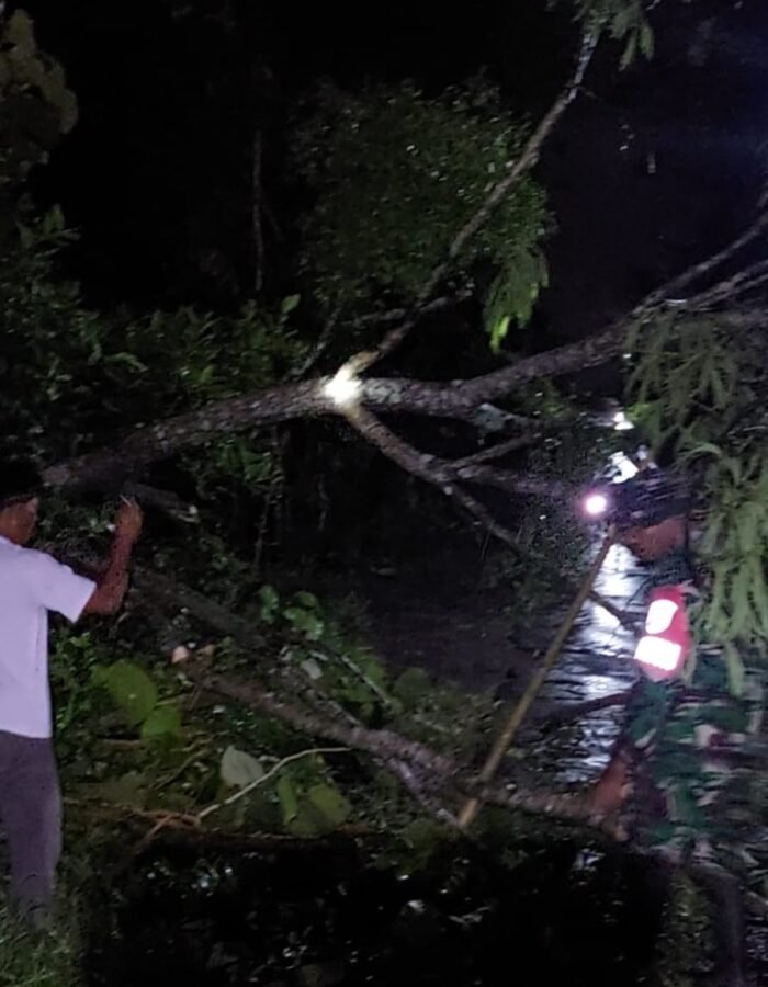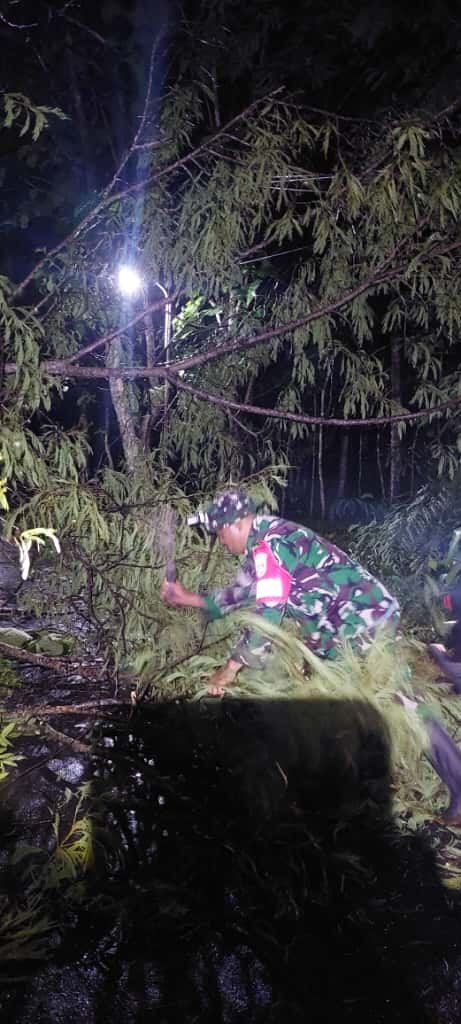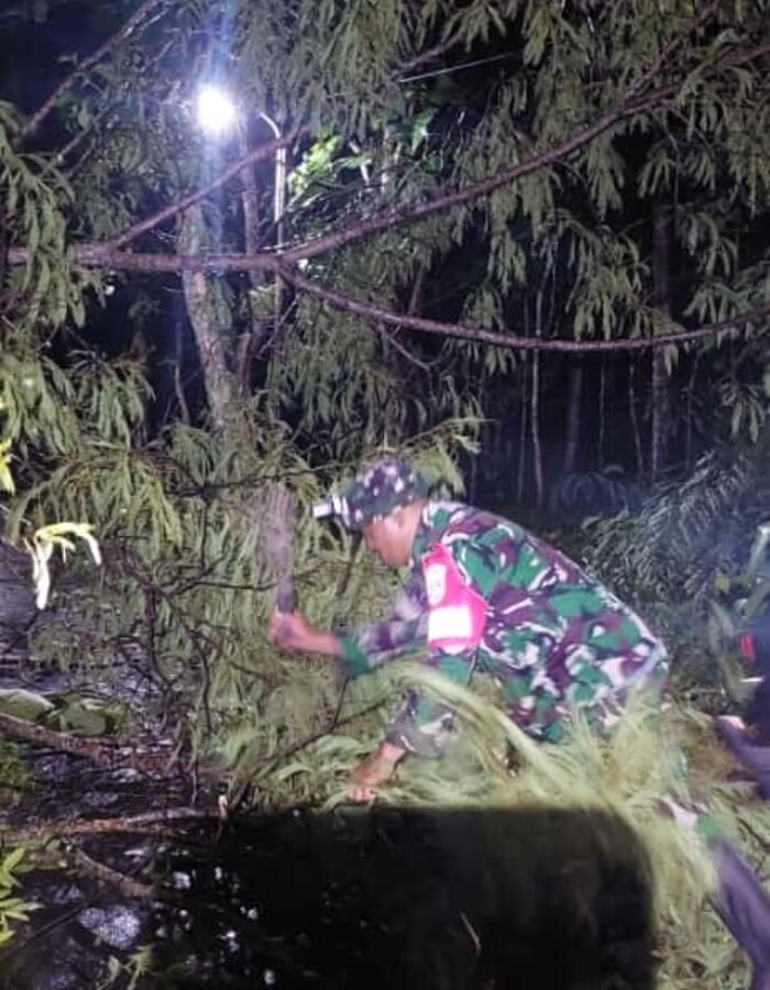 Peristiwa tersebut tak hanya menyebabkan kemacetan, tetapi juga berpotensi membahayakan pengguna jalan yang melintas. Tanpa menunggu lama, Babinsa Sertu Budi Utomo langsung turun ke lokasi untuk berkoordinasi dengan aparat desa dan warga setempat. Dengan sigap mereka bergotong royong menggunakan gergaji dan parang untuk membersihkan ranting serta batang pohon yang menghalangi jalan.