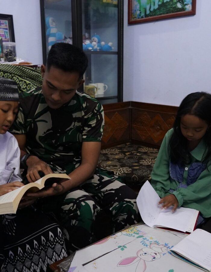 Dalam kegiatan tersebut anggota TNI, Serda Raka bersama Prada Rofi, turun langsung menjadi pengajar. Dengan penuh kesabaran dan semangat, keduanya membimbing anak-anak dalam belajar membaca, menulis, serta berhitung. Suasana belajar pun berlangsung hangat dan penuh antusias.