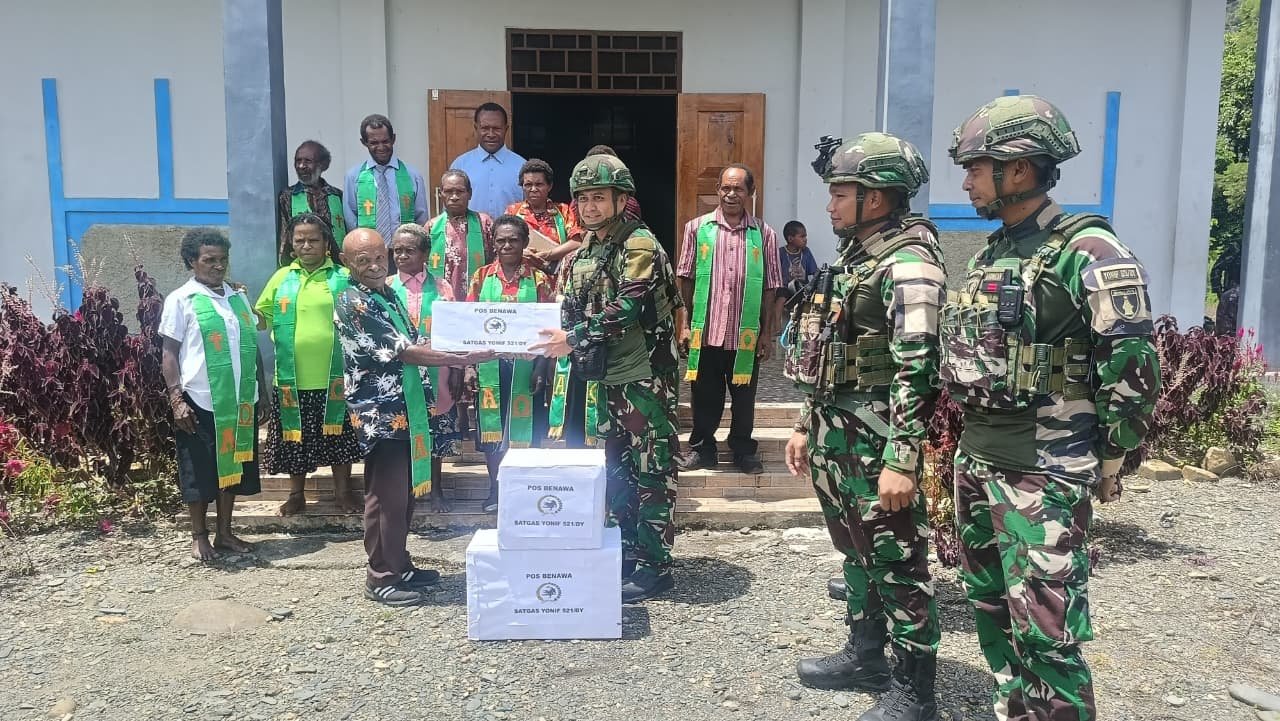 BATAVIAINEWS.COM Benawa, –Dalam rangka mempererat hubungan dan menjalin kebersamaan dengan masyarakat di wilayah perbatasan, Satgas Yonif 521/DY Pamtas RI–PNG Kewilayahan Pos Benawa melaksanakan kegiatan sosial berupa pembagian bingkisan makanan kepada masyarakat Benawa, Kabupaten Yalimo, Papua Pegunungan (16/11/2025).