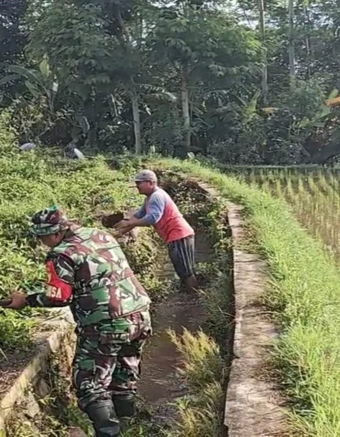 Bersihkan Saluran Irigasi Sawah, Sertu Yudha Gotong Royong Bersama Warga Desa Ngreco