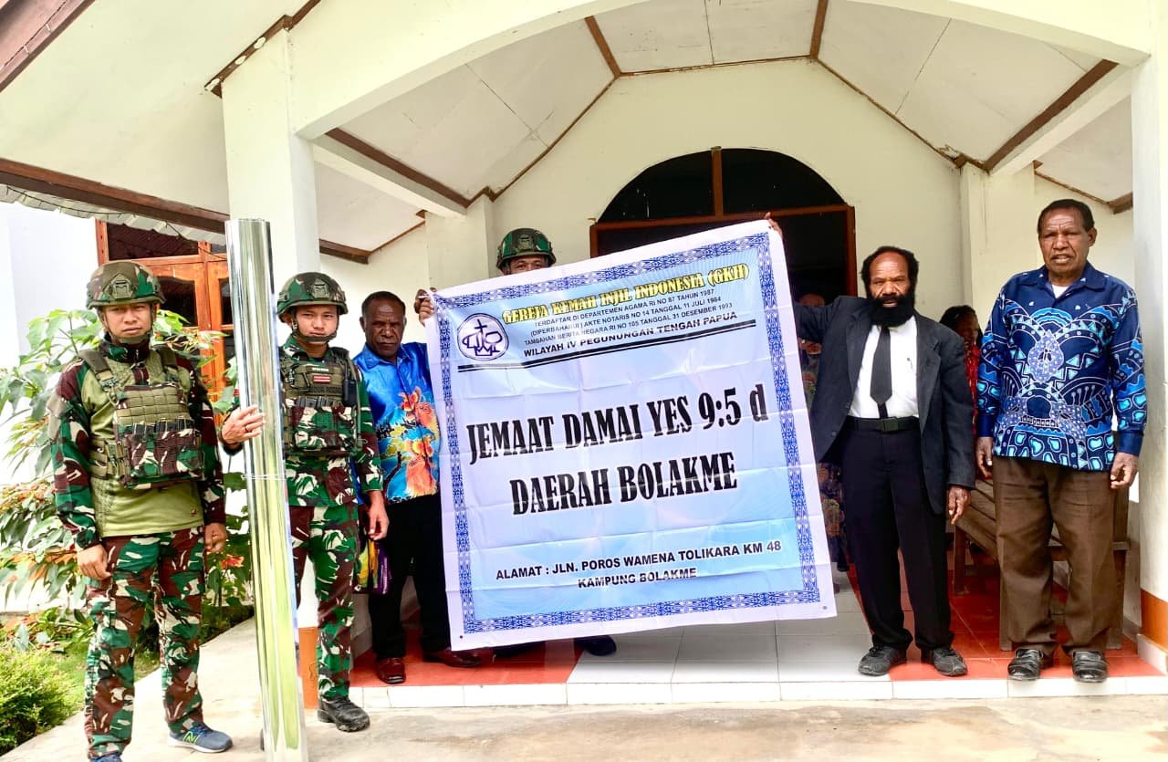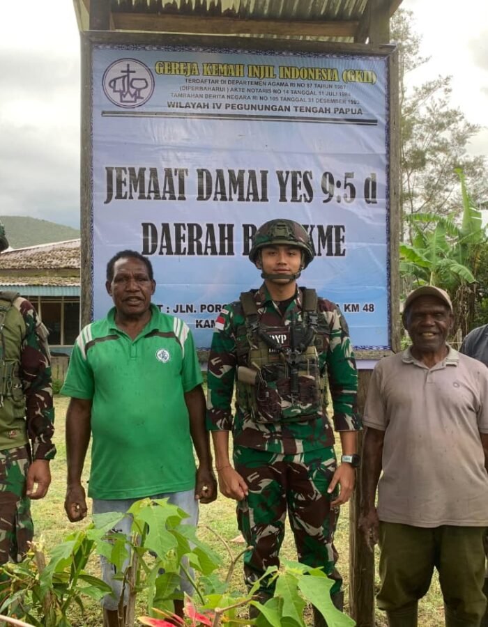 Dalam sebuah inisiatif yang menyentuh hati, Satgas Yonif 521/DY melalui Pos Bolakme turun langsung ke lapangan, bahu-membahu bersama jemaat lokal untuk memperbaiki papan nama Gereja Kemah Injil Indonesia (GKII) yang telah usang.