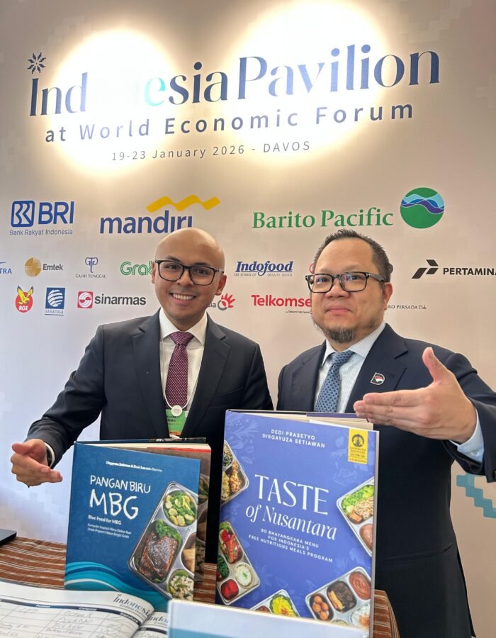 “Saya menyerahkan buku Rasa Bhayangkara Nusantara versi Bahasa Inggris kepada Bapak Stefanus Ade Hadiwidjaja, Managing Director, Investment, Danantara Indonesia, untuk ditampilkan di Paviliun Indonesia pada WEF Davos 2026 sebagai bagian dari showcase diplomasi MBG dan khazanah rasa Nusantara,” ujar Dirgayuza Setiawan.