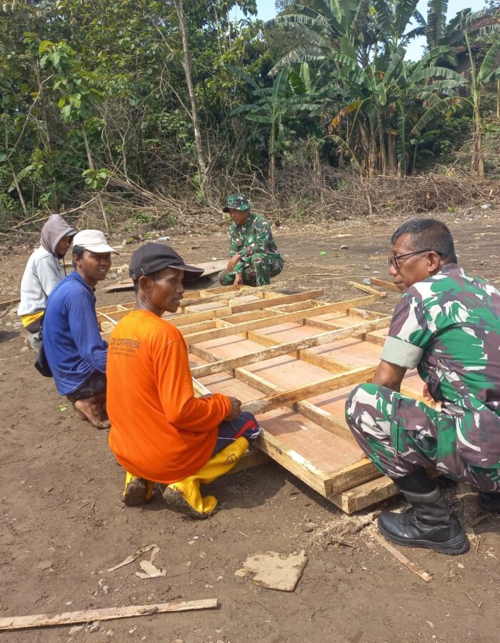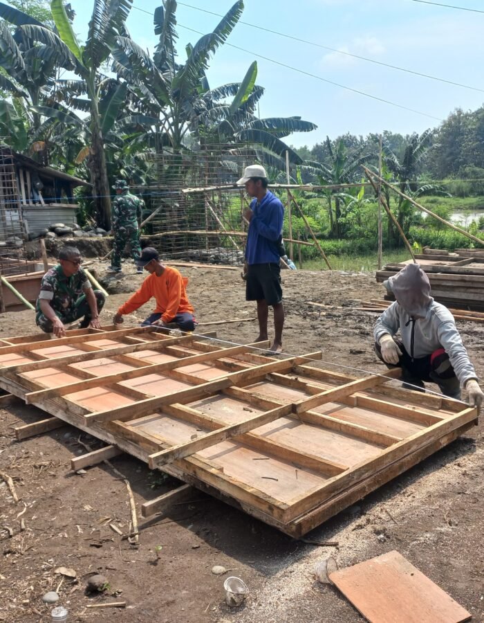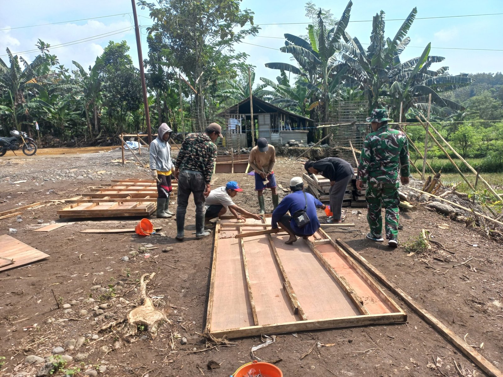 Terlihat di lapangan, anggota TNI bersama warga bekerja sama memasang papan risplang dengan teliti.