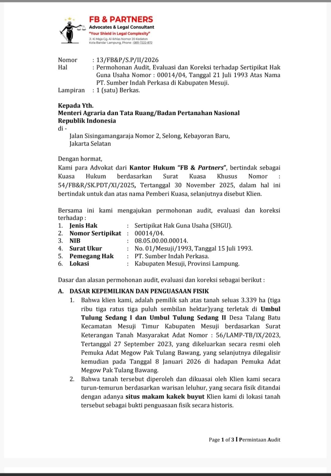BATAVIAINEWS.COM Kabupaten Mesuji, senin 9 febuari 2026 angkatan muda badik lampung mendesak bupati mesuji untuk mencabut izin PT SIP bila tidak melepaskan Tanah adat tersebut. Juga memohon kepada kementerian ATR/BPN untuk mengaudit HGU nomor00014/04tanggal21 juli1993 dan mencabut nya garapan yang merupakan warisan turun-temurun keluarga ahli waris Wen Aperli dan Hasanudin diduga telah diserobot oleh PT SIP sejak tahun 1993 dan dijadikan lahan Hak Guna Usaha (HGU).