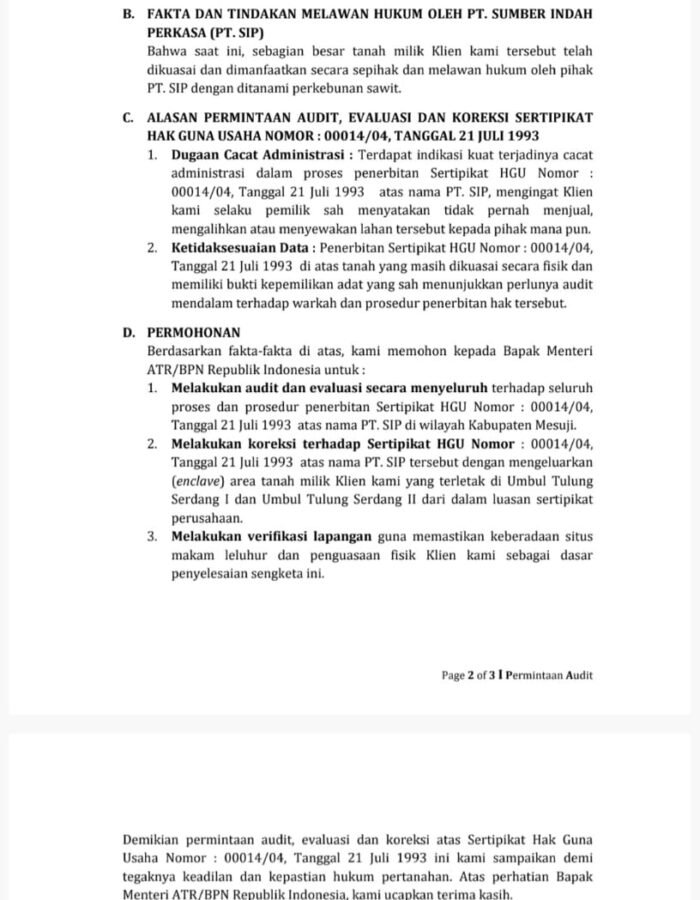 Atas kondisi tersebut, para ahli waris berharap agar pemerintah daerah, instansi pertanahan, serta pihak-pihak berwenang dapat melakukan penelusuran dan klarifikasi secara menyeluruh terhadap proses penerbitan HGU dimaksud.