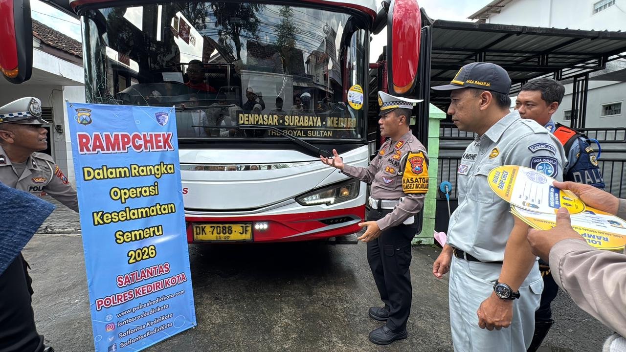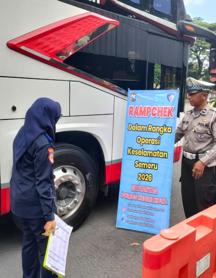 BATAVIAINEWS.COM Kediri Kota – Satuan Lalu Lintas Polres Kediri Kota bersama instansi terkait melaksanakan kegiatan rampcheck kendaraan angkutan umum di Terminal Tamanan, Kecamatan Mojoroto, Kota Kediri, pada Jumat (6/2/2026) pagi. Kegiatan ini dilaksanakan dalam rangka mendukung pelaksanaan Operasi Lilin Semeru 2025 guna memastikan keselamatan dan kelayakan angkutan umum.