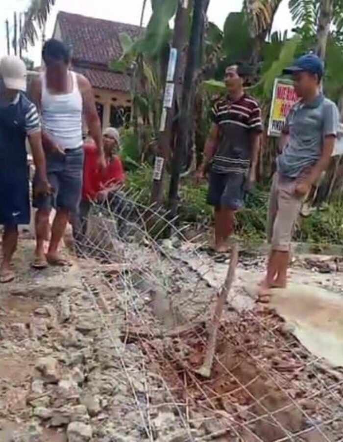 Saat awak media turun ke lokasi, warga terlihat tengah membongkar konstruksi yang telah patah. Dari hasil pantauan visual, muncul dugaan kuat bahwa kualitas pekerjaan tidak maksimal. Besi tulangan diduga berdiameter kecil dan campuran semen dinilai kurang kuat, sehingga struktur tidak mampu menahan beban dalam waktu lama.