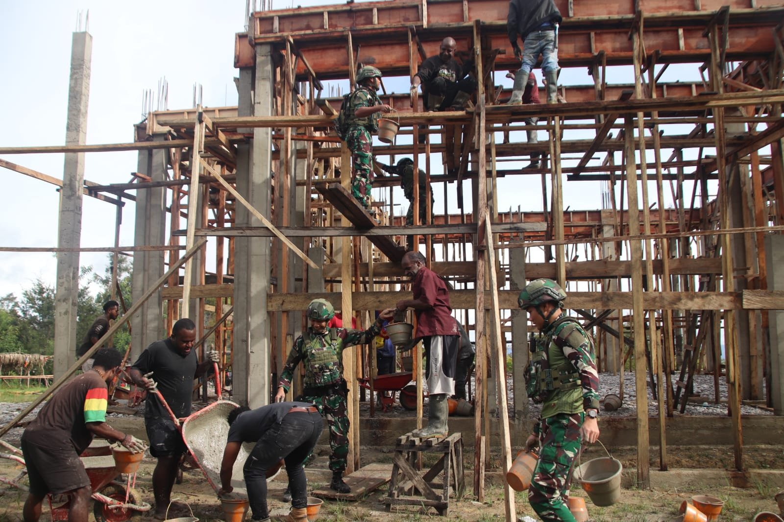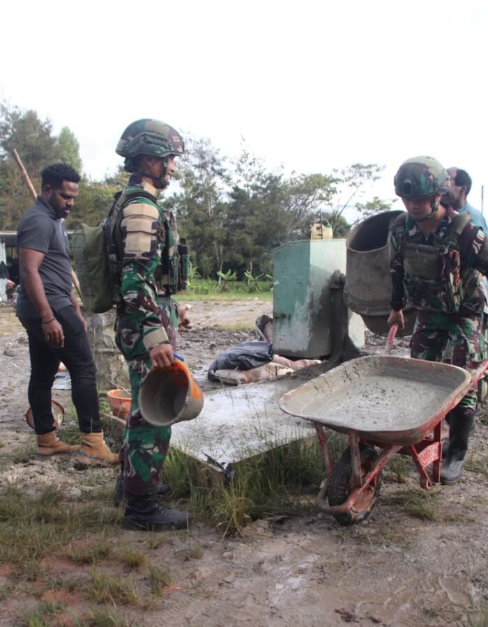 BATAVIAINEWS.COM Walesi – Satgas Yonif 521/DY turut serta dalam kegiatan gotong royong pembangunan Masjid Muhammad Aipon Asso yang berlokasi di Distrik Walesi, Kabupaten Jayawijaya, Provinsi Papua Pegunungan. (13/2/2026)