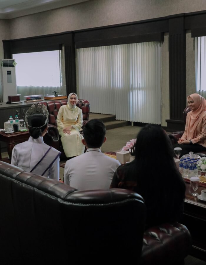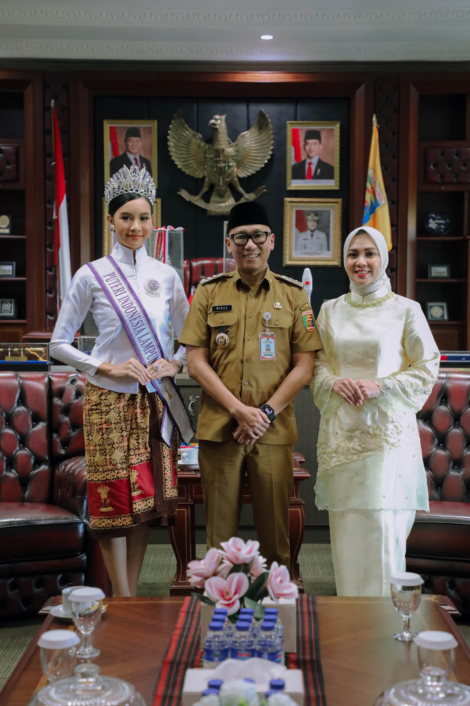 BATAVIAINEWS.COM BANDAR LAMPUNG — Gubernur Lampung Rahmat Mirzani Djausal bersama Ketua TP PKK Provinsi Lampung Purnama Wulan Sari Mirza menerima Puteri Indonesia Lampung 2026 Agita Nazara, di Ruang Kerja Gubernur, Bandarlampung, Senin (30/03/2026).