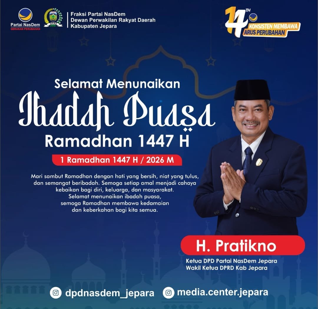BATAVIAINEWS.COM JEPARA– Menyambut datangnya bulan suci Ramadhan 1447 Hijriah / 2026 Masehi, Wakil Ketua III DPRD Kabupaten Jepara dari Fraksi Partai NasDem, H. Pratikno, menyampaikan ucapan selamat menunaikan ibadah puasa kepada seluruh masyarakat Kabupaten Jepara.