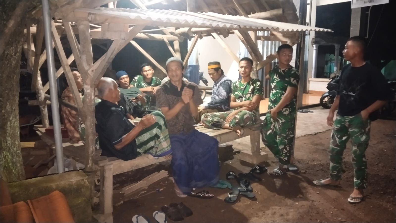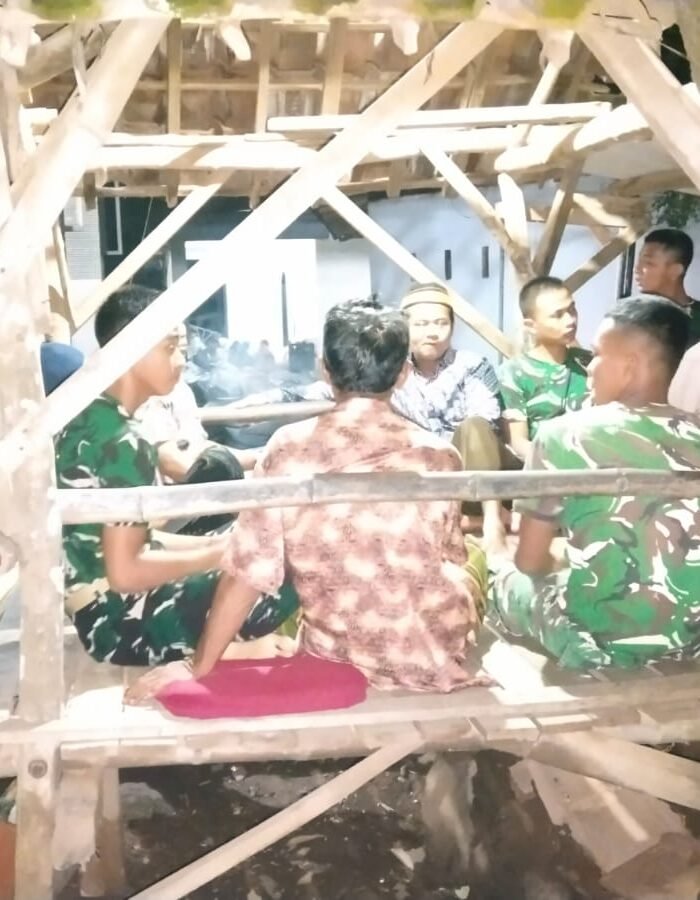 Di bawah penerangan lampu sederhana, prajurit berseragam loreng terlihat membaur tanpa sekat dengan masyarakat. Sebagian duduk di bangku kayu gardu ronda, lainnya berdiri mengawasi sekitar permukiman. Kebersamaan itu mencerminkan peran aktif Satgas dalam menjaga kondusivitas desa.