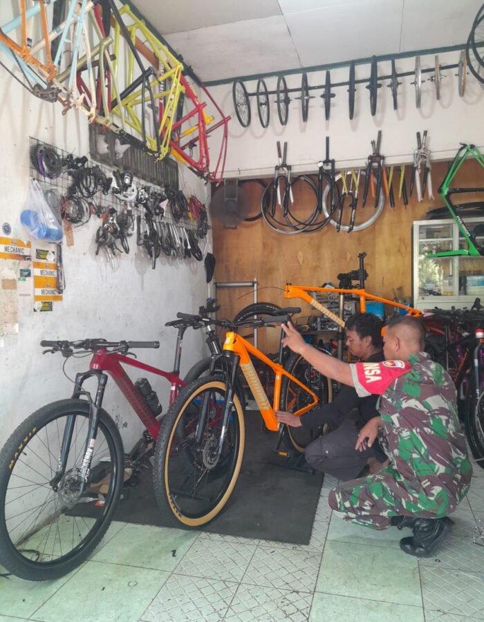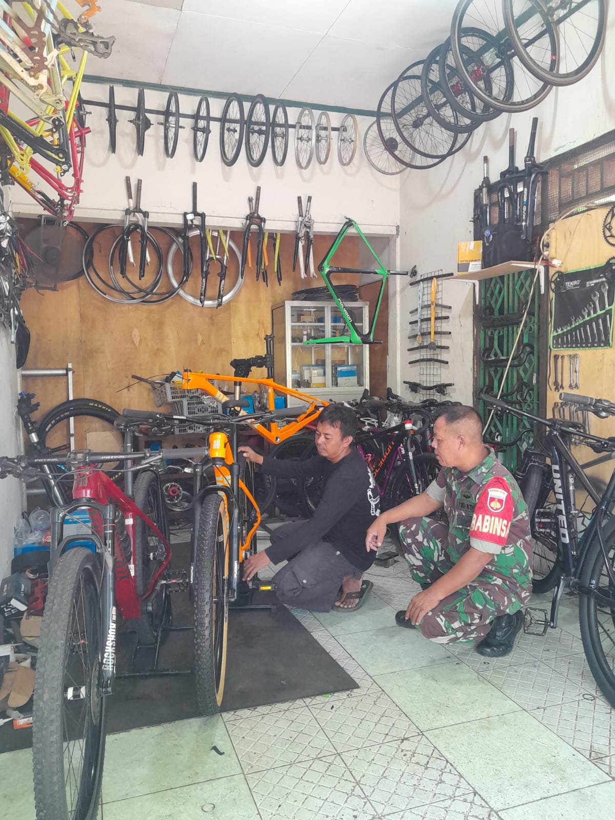 BATAVIAINEWS.COM Surakarta – Dalam rangka melaksanakan Pembinaan Teritorial (Binter) dan implementasikan Pembinaan Pertahanan (Bintahwil) di wilayah binaan, Babinsa Jayontakan Koramil 03/Serengan Kodim 0735/Surakarta Serka Sudiyono datangi dan Motivasi Bapak Jupri pelaku UMKM yang keseharian berjualan Sepeda dan sekaligus bengkel sepeda