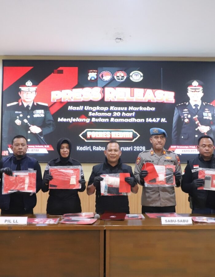 Hasil pengungkapan tersebut disampaikan Kapolres Kediri AKBP Bramastyo Priaji, S.H., S.I.K., M.Si. melalui Kasatresnarkoba Polres Kediri AKP Sujarno, S.H., M.H. dalam konferensi pers yang digelar di Aula Wicaksana Laghawa Mapolres Kediri, Rabu (18/2/2026).