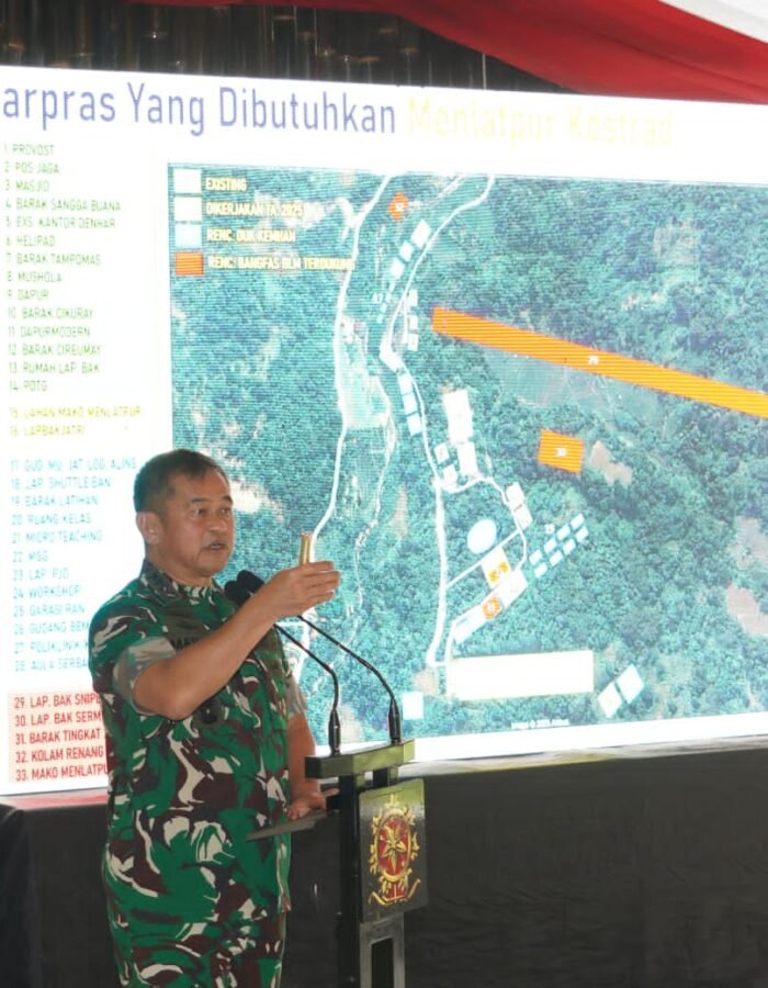 Dalam rangkaian kegiatan tersebut, Kasad dan para pejabat utama Mabesad juga meninjau secara singkat pembangunan dan renovasi fasilitas Menlatpur Kostrad yang diproyeksikan sebagai sarana pendukung latihan terpadu bagi satuan-satuan TNI AD.
