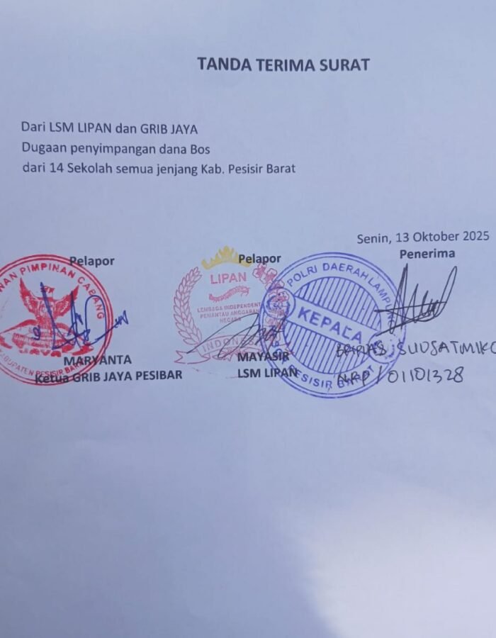 Kedua kalinya Riyan ketua dpc grib jaya pesisir barat datang ke ruang Tipikor menanyakan hal yang sama terkait sejauh mana perkembangan penanganan dugaan penyalahgunaan dana Bos di 14 sekolah di kabupaten pesisir Barat, namun jawaban yang didapat sangat mirip dengan pernyataan pihak polres bagian Tipikor saat ditanya pada 22/10/2025 lalu bahwa surat laporan tersebut belum turun atau disposisi dari Kapolres ke unit tipikor mapolres pesisir barat, dan Kapolres masih dinas Luar dan belum kembali ke Polres Pesisir Barat.