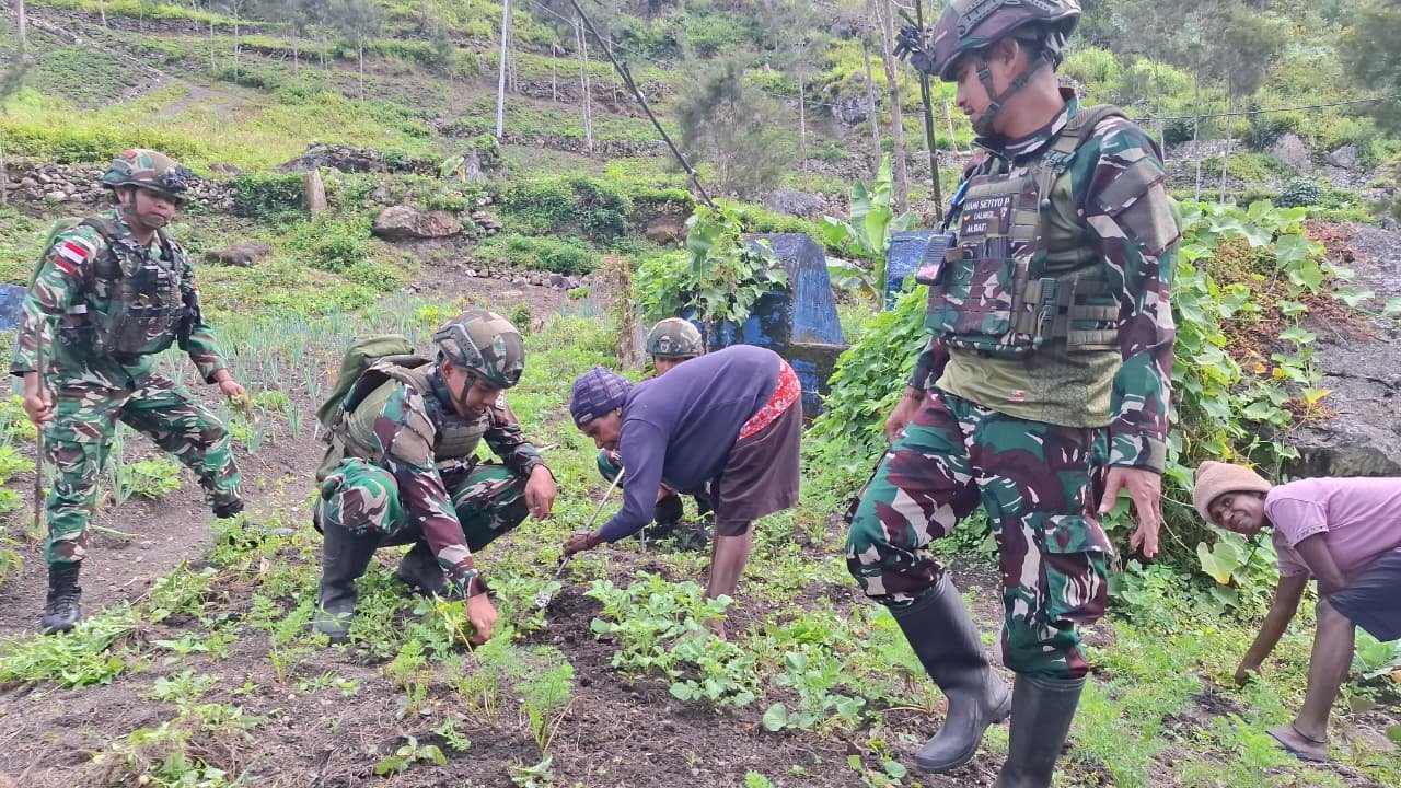 Prajurit Satgas Yonif 521/DY aktif membantu warga Papua membuka lahan, mengolah kebun, dan memanen hasil tani, seperti sayuran dan umbi-umbian, Kegiatan ini menciptakan kedekatan dan rasa kekeluargaan antara TNI dan Masyarakat.