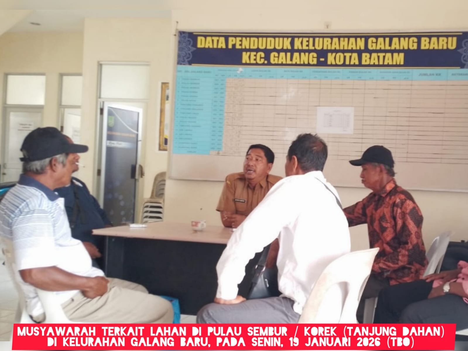 BATAM ¦ “Dari pihak Kelurahan Galang Baru, menyampaikan bahwa Tanjung Melagan, Tanjung Pengapit (Ketua Rt 02 Sapdani, red) tidak punya hak menandatangani masalah lahan, karena memang bukan wilayah kerjanya. Itu wilayah RT Korek/RW 01, Pulau Sembur. Memang ada beberapa KK pemukiman warga RT Sapdani di lokasi, namun itu hanya untuk tujuan administratif pendataan bantuan pemerintah (misal bansos),” ungkap salah seorang warga yang ikut dalam pertemuan di Kelurahan Galang Baru, Rabu (21/1).