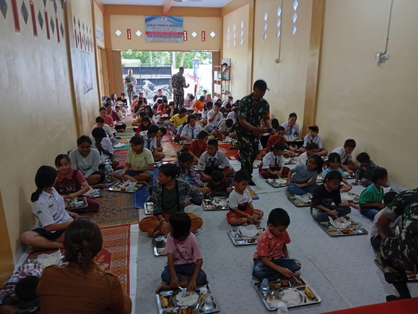 Suasana pembagian paket berlangsung penuh kehangatan. Anak-anak di panti asuhan tampak gembira dan antusias menerima makanan bergizi yang disiapkan langsung oleh prajurit TNI.
