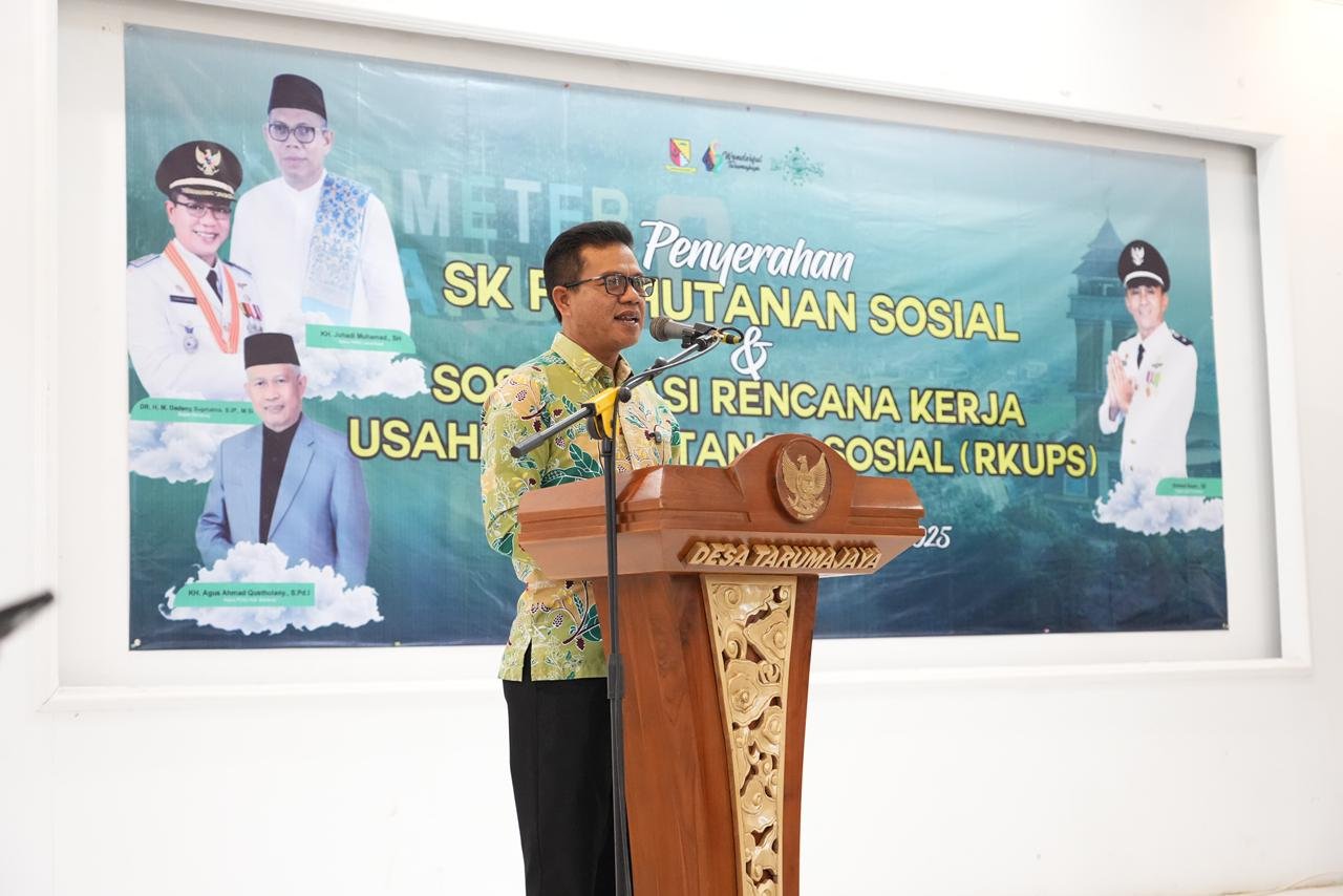 KAB. BANDUNG – BATAVIAINEWS.COM-Bupati Bandung Dadang Supriatna menghadiri penyerahan SK (Surat Keputusan) Perhutanan Sosial Lembaga Pengelolaan Hutan Desa (LHPD) Al Fatih sekaligus sosialisasi Rencana Kerja Usaha Perhutanan Sosial (RKUPS) di Aula Desa Desa Tarumajaya Kecamatan Kertasari Kabupaten Bandung, Kamis (11/12/2025).