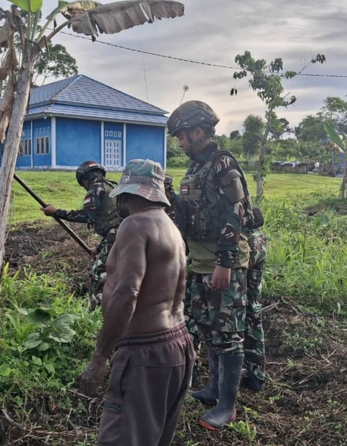 Personel Satgas Yinif 521/DY kembali menunjukkan kepedulian mereka terhadap kemandirian pangan masyarakat dengan membantu warga membuka dan menyiapkan kebun di lahan kosong milik kampung di Kobakma, Mamberamo Tengah, Papua Pegunungan (19/11/2025).