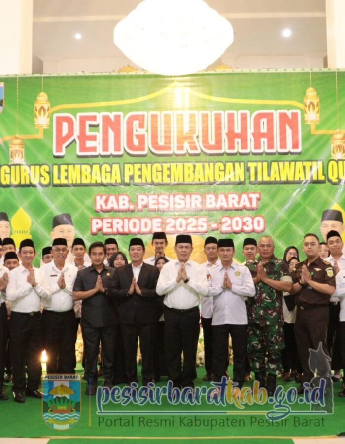 Bupati Pesisir Barat (Pesibar). BATAVIAINEWS.COM – Dedi Irawan mengukuhkan pengurus Lembaga Pengembangan Tilawatil Quran (LPTQ) Pesibar periode 2025-2030, di Lobi Lantai 1 Gedung Marga Sai Batin Komplek Perkantoran Pemkab Pesibar, Senin (20/10/2025).