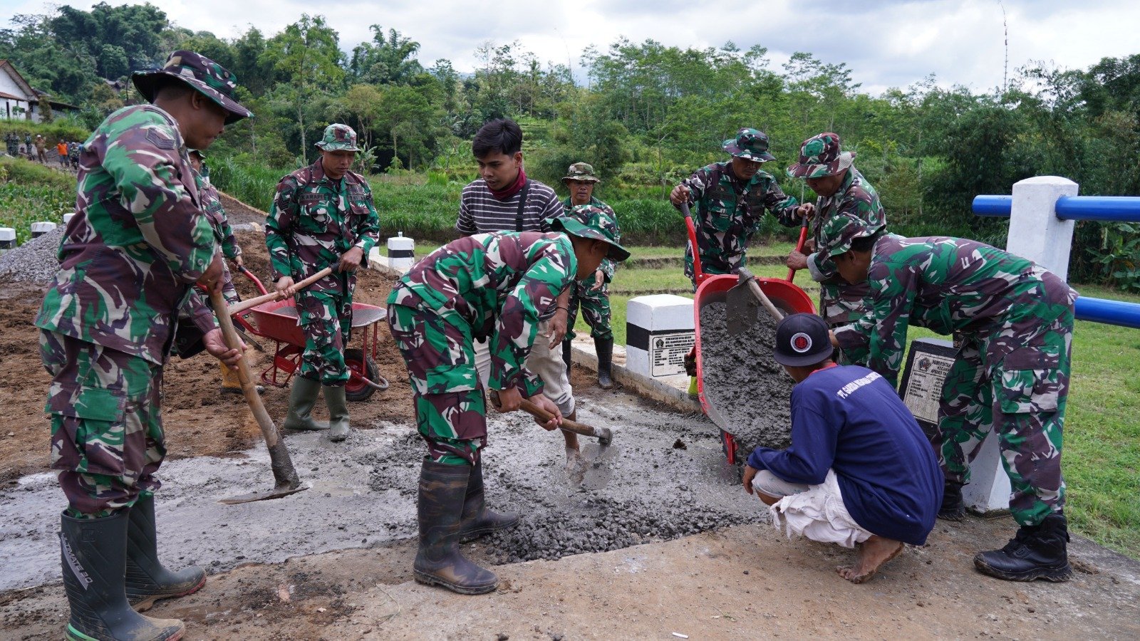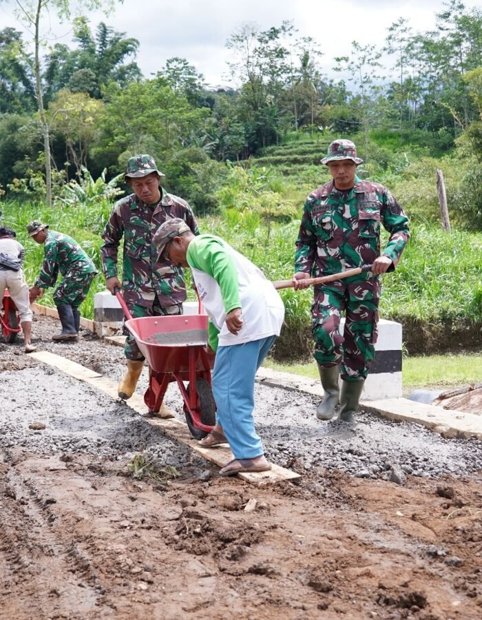Anggota TNI bersama warga setempat tampak bahu-membahu melaksanakan pengecoran, mulai dari pengangkutan material hingga perataan adukan semen. Semangat gotong royong yang terjalin menunjukkan kuatnya kemanunggalan TNI dan rakyat dalam mendukung percepatan pembangunan di wilayah pedesaan.