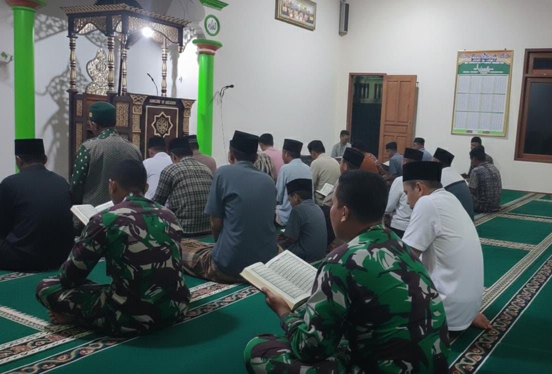Memasuki hari pertama Sholat Tarawih, personel Satgas melaksanakan Shalat Tarawih dan Tadarus bersama warga di Masjid Al-Hidayah, Desa Kembang, Rabu Malam (18/2/2026).