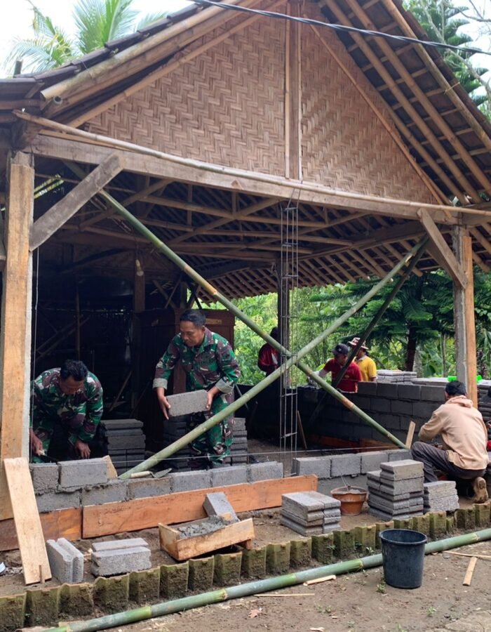 Sejak pagi hari, personel Satgas TMMD bersama warga setempat terlihat bahu membahu mengerjakan proses pembangunan, mulai dari pekerjaan pondasi, pemasangan rangka, hingga penyusunan dinding.