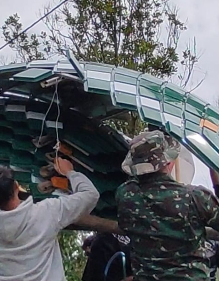 Proses pemasangan kubah dilakukan dengan penuh kehati-hatian dan gotong royong. Sejumlah prajurit TNI bekerja sama dengan warga menaikkan kubah menggunakan tangga. Sementara di bagian bawah, warga lain ikut membantu menyiapkan bagian yang lain serta memastikan setiap tahap berjalan aman dan lancar. Suasana kerja penuh semangat dan canda tawa membuat kegiatan tersebut terasa hangat di tengah teriknya sinar matahari.