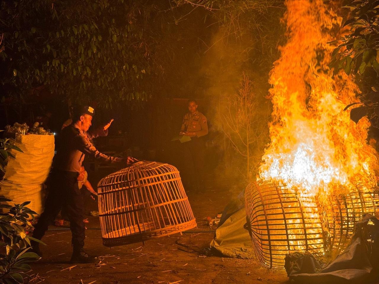Dari lokasi tersebut, petugas menemukan beberapa barang bukti, di antaranya kandang ayam berbahan besi dan bambu, lampu penerangan, jam dinding, serta alas yang diduga digunakan sebagai arena. Seluruhnya kemudian diamankan sebagai bagian dari proses penertiban.
