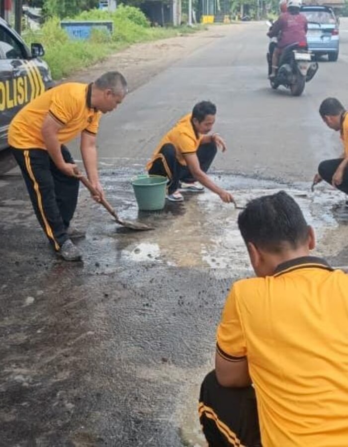 Dalam kegiatan tersebut, personel Polsek Krian dan Polsek Balongbendo bersama warga sekitar bergotong royong menutup lubang jalan menggunakan material penimbun.