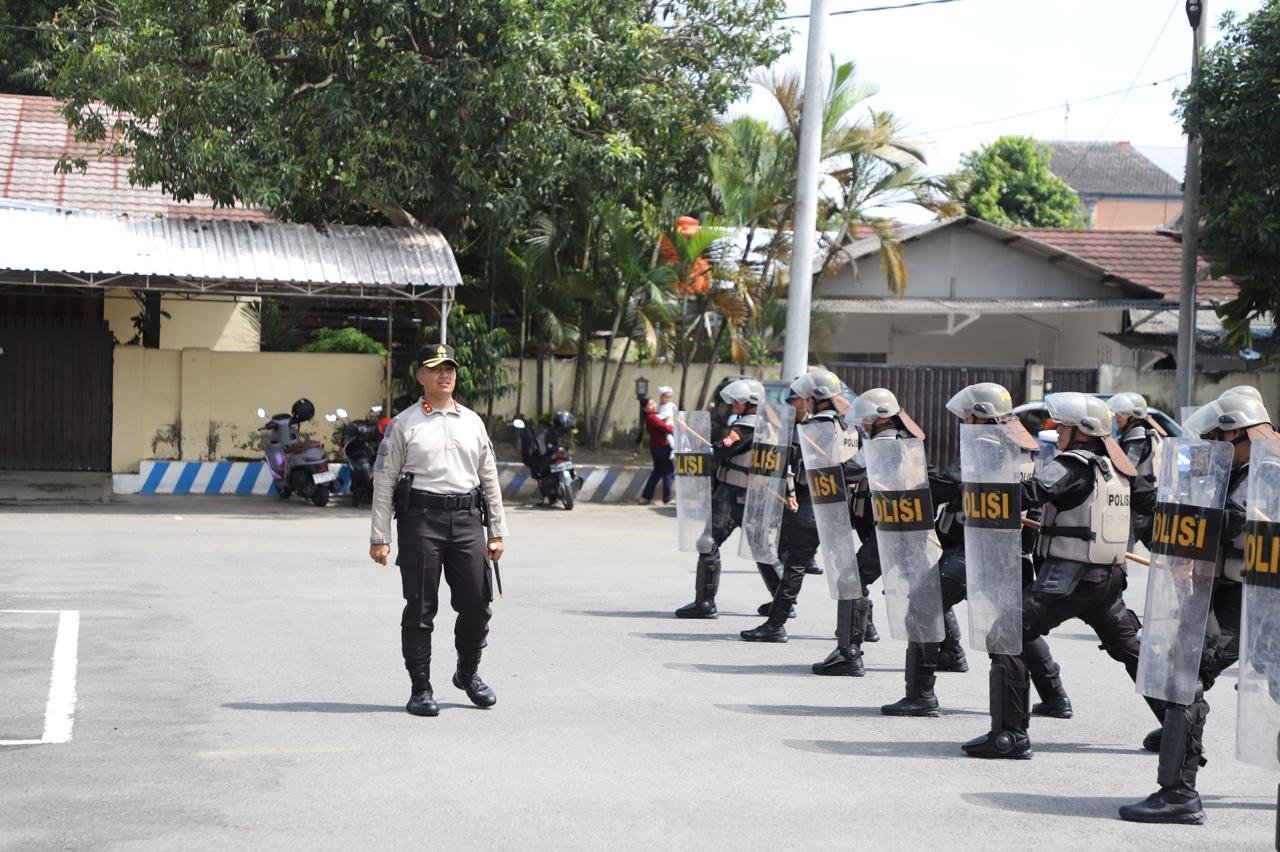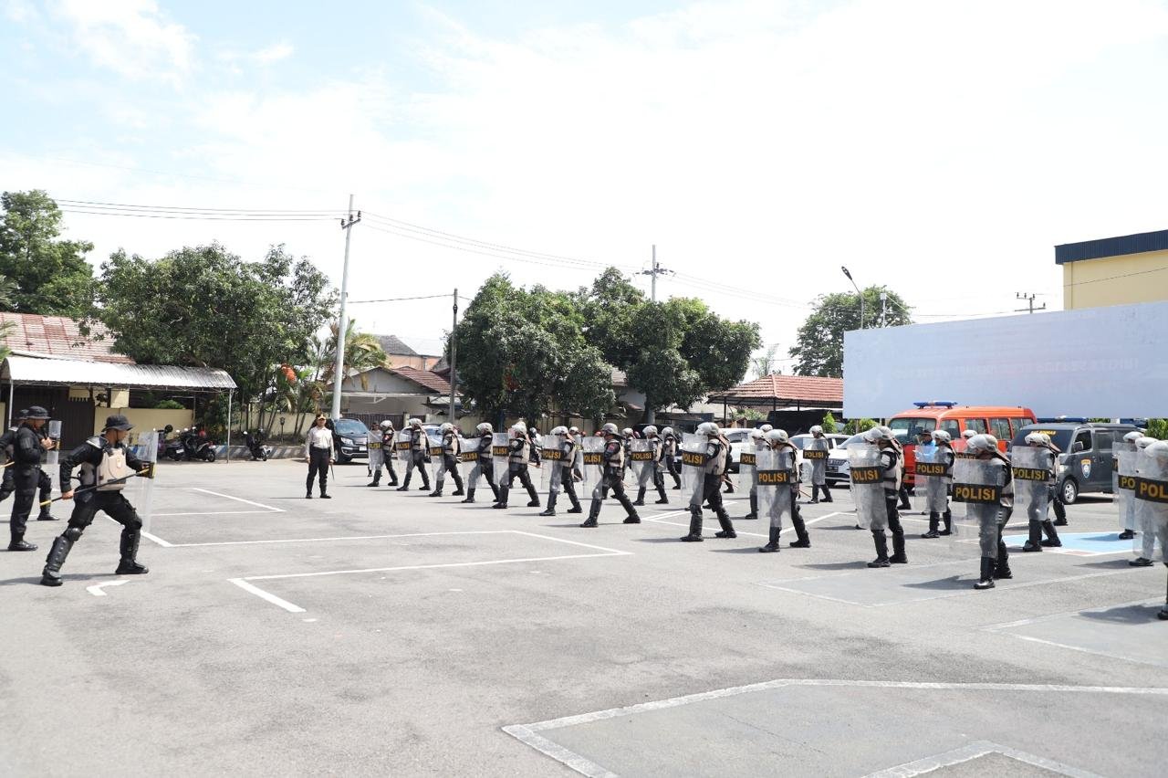 Dengan penuh semangat dan disiplin tinggi, Para peserta latihan menjalani simulasi penanganan massa, mulai dari formasi, teknik pengamanan, hingga penanganan evakuasi.