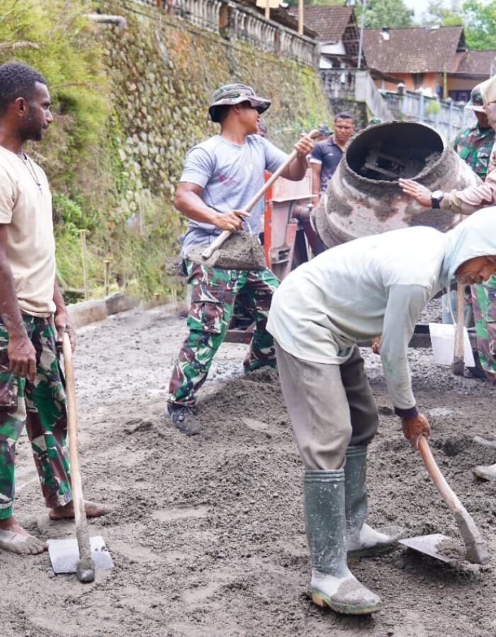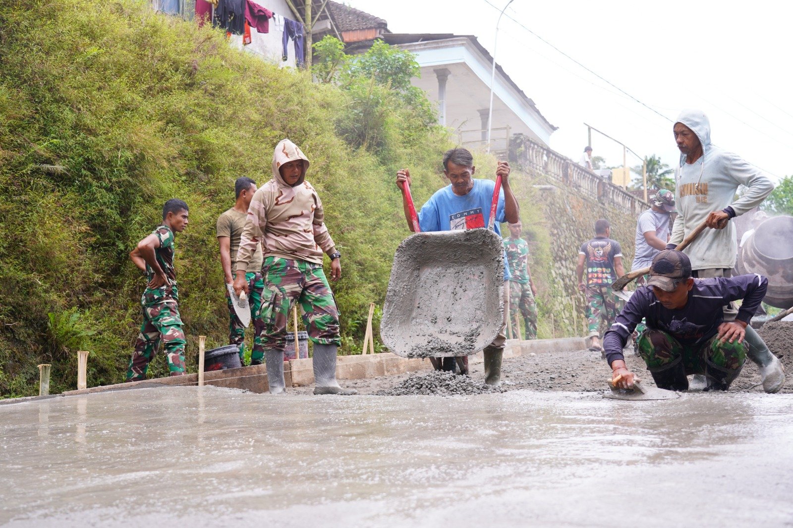 Anggota Satgas TMMD bersama warga setempat bahu-membahu menyelesaikan pengecoran jalan yang sebelumnya masih berupa tanah. Dengan semangat gotong royong, proses pembangunan berjalan lancar meski membutuhkan tenaga dan ketelitian tinggi demi menghasilkan jalan yang kuat dan tahan lama.