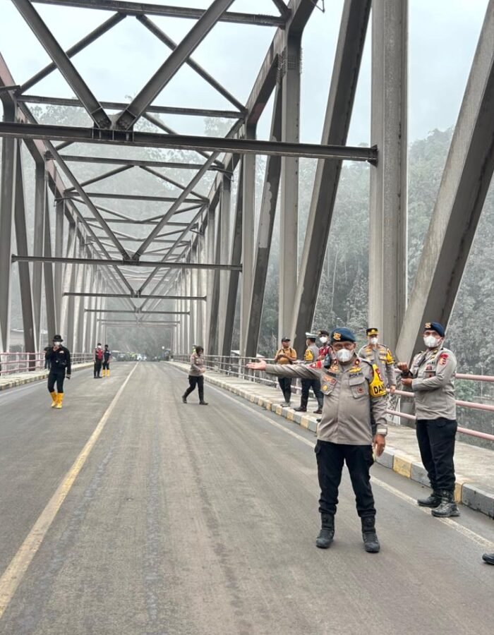 Personel Polri yang berjaga mengingatkan warga agar tetap waspada terhadap potensi bahaya, seperti aliran lahar dingin, material vulkanik, serta kondisi tanah yang labil di sekitar bantaran sungai.
