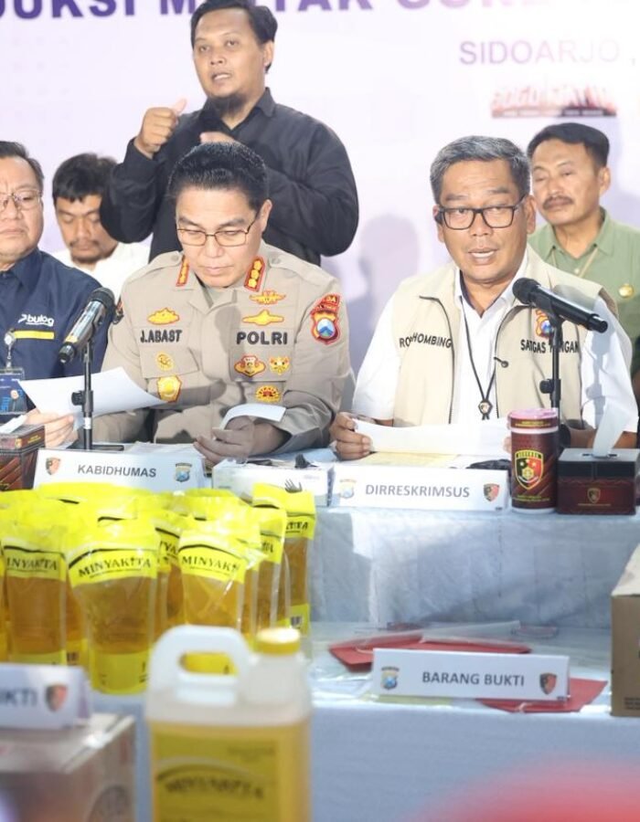 “Pada hari ini kami menyampaikan terkait pengungkapan kasus tindak pidana produksi minyak goreng sawit MinyaKita ilegal, khususnya yang berkaitan dengan standar mutu, label, dan takaran,” ujar Kombes Abast.