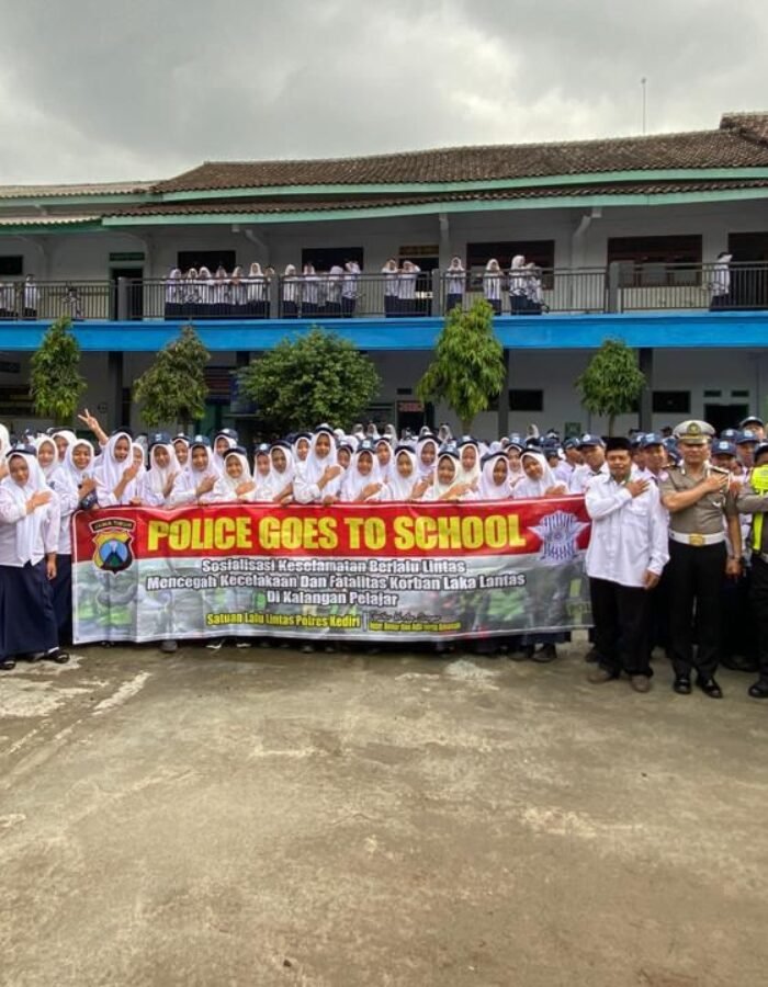Melalui program Police Goes to School, jajaran Satlantas Polres Kediri memberikan edukasi langsung kepada para siswa MTs Nidhomiyah, Desa Canggu, Kecamatan Badas, Kabupaten Kediri, Senin (12/1/2026) pagi.
