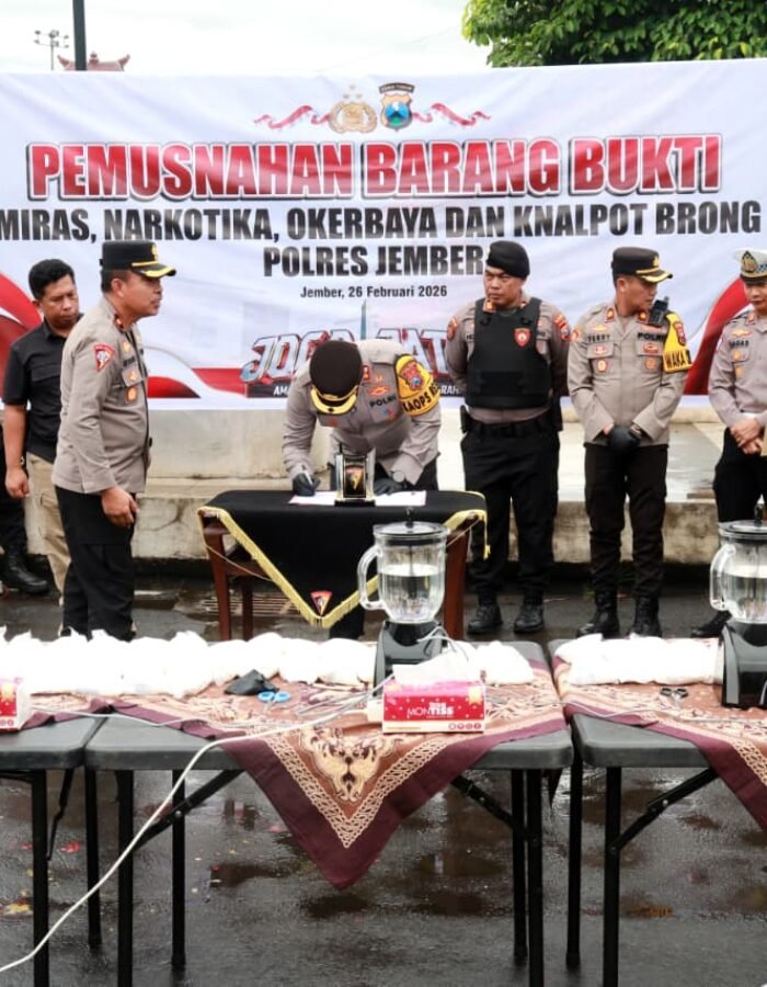 Kali ini Polres Jember bersama jajaran Forum Koordinasi Pimpinan Daerah (Forkopimda) Kabupaten Jember memusnahkan ribuan botol minuman keras, narkotika, hingga knalpot tidak sesuai spesifikasi hasil Operasi Penyakit Masyarakat (Pekat).