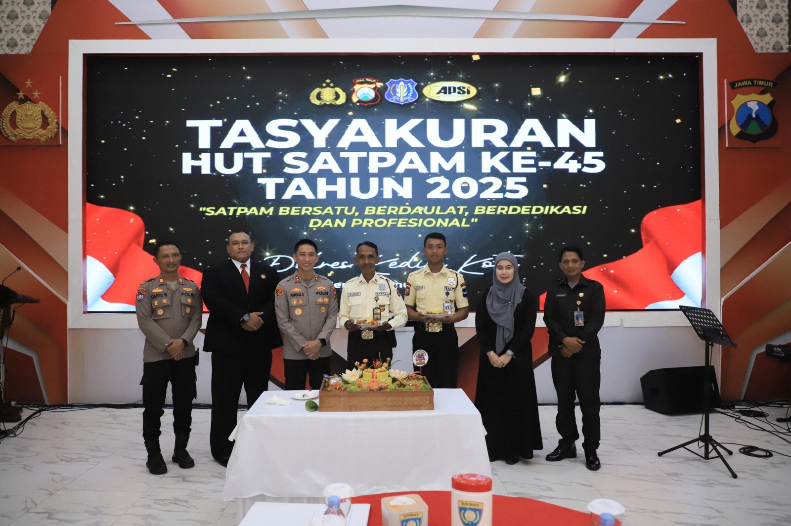 Acara tasyakuran dipimpin langsung oleh Kapolres Kediri Kota AKBP Anggi Saputra Ibrahim, S.H., S.I.K., M.H. dan dihadiri oleh Pejabat Utama (PJU) Polres Kediri Kota, para Kanit dan personel Satbinmas, Ketua Panitia Bapak Wiyono, Ketua APSI Bapak Panut, perwakilan Badan Usaha Jasa Pengamanan (BUJP) Ibu Tia, koordinator satpam, serta perwakilan personel satpam se-Kota Kediri.