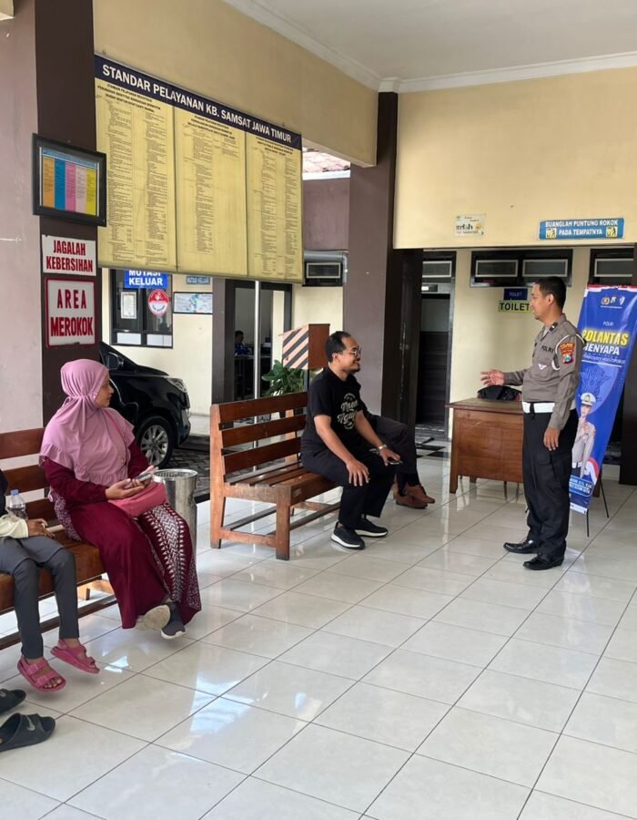 BATAVIAINEWS.COM KEDIRI KOTA – Satuan Lalu Lintas (Satlantas) Polres Kediri Kota Polda Jatim terus berupaya memperkuat kepercayaan publik terhadap polri melalui program “Polantas Menyapa” dengan memberikan sosialisasi langsung kepada masyarakat mengenai berbagai layanan yang tersedia di Kantor Samsat Kediri Kota termasuk layanan kilat Samsat Drive Thrue.