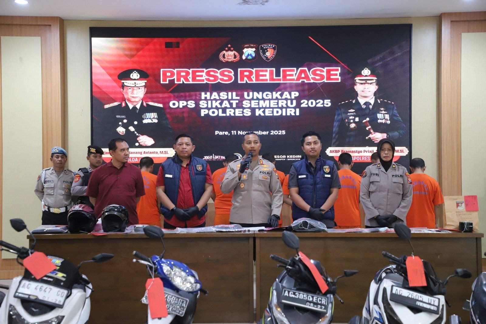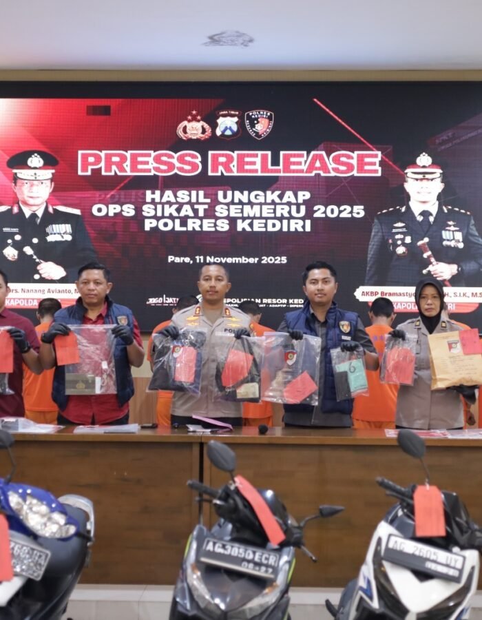“Polres Kediri senantiasa berkomitmen menghadirkan suasana yang aman dan nyaman, serta mengajak seluruh masyarakat untuk bersama-sama menjaga kamtibmas,” ungkap Kapolres Kediri dalam konferensi pers di Aula Wicaksana Laghawa Mapolres Kediri, Selasa (11/11/2025) pagi.