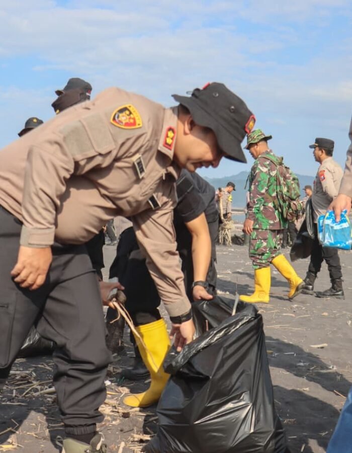 Sejak pagi, personel Polres Lumajang Polda Jatim bersama instansi lintas sektor dan masyarakat setempat tampak bahu-membahu membersihkan sampah di sepanjang pesisir pantai.