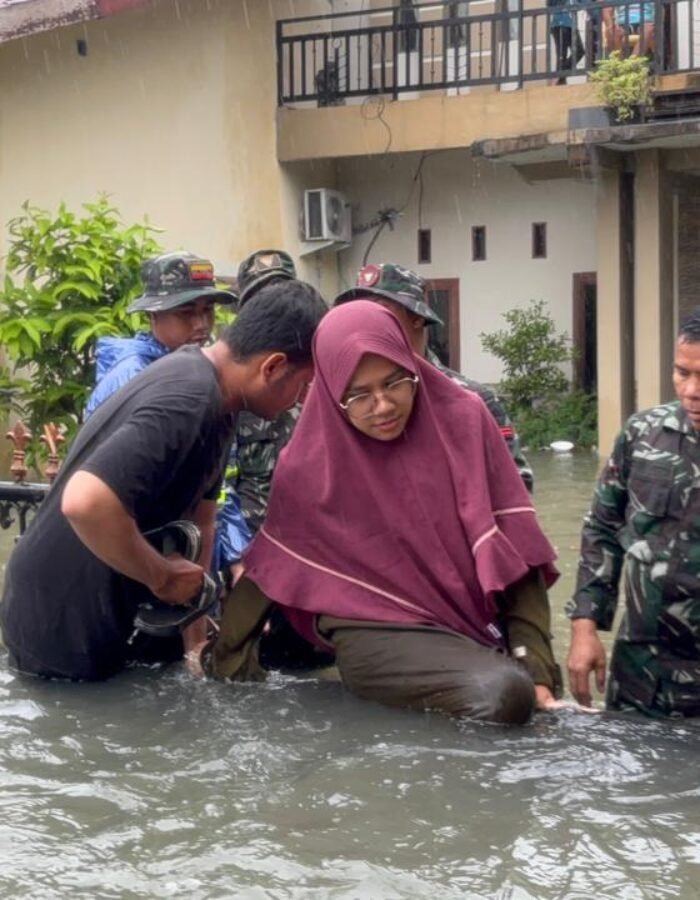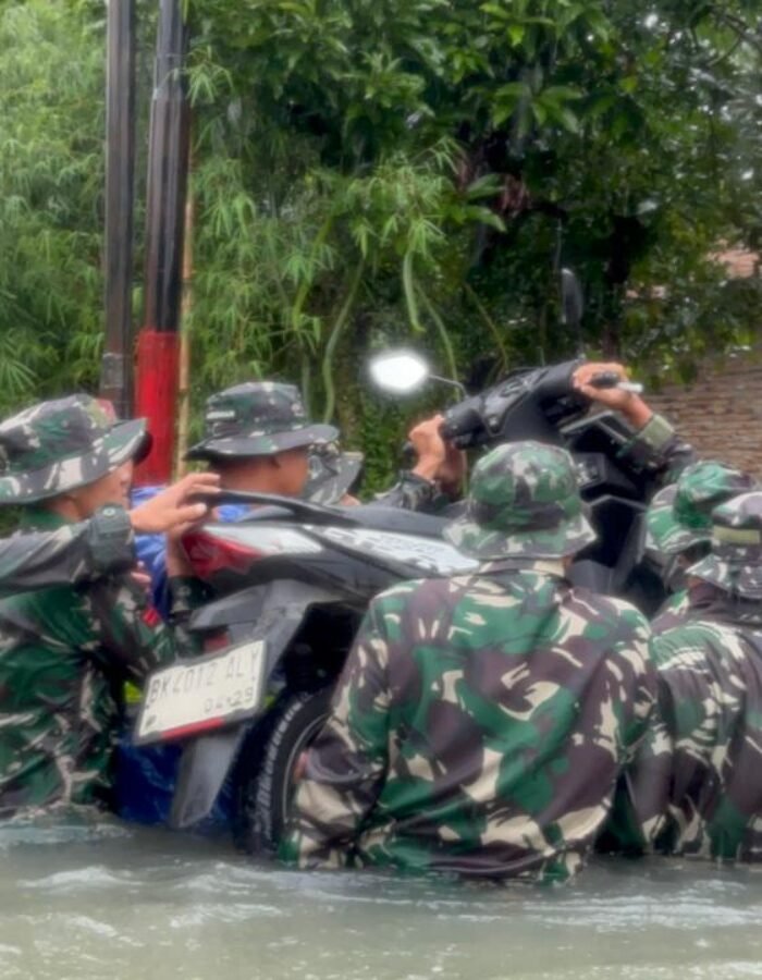BATAVIAINEWS.COM MEDAN – Prajurit Yonkav 6/NK bergerak cepat mengevakuasi warga yang terjebak banjir di Gg. Family, Lingkungan V, Kelurahan Asam Kumbang, Kota Medan, Kamis (27/11/2025). Banjir dengan ketinggian sekitar 1,5 meter merendam puluhan rumah setelah hujan deras mengguyur wilayah tersebut sejak pagi hari.