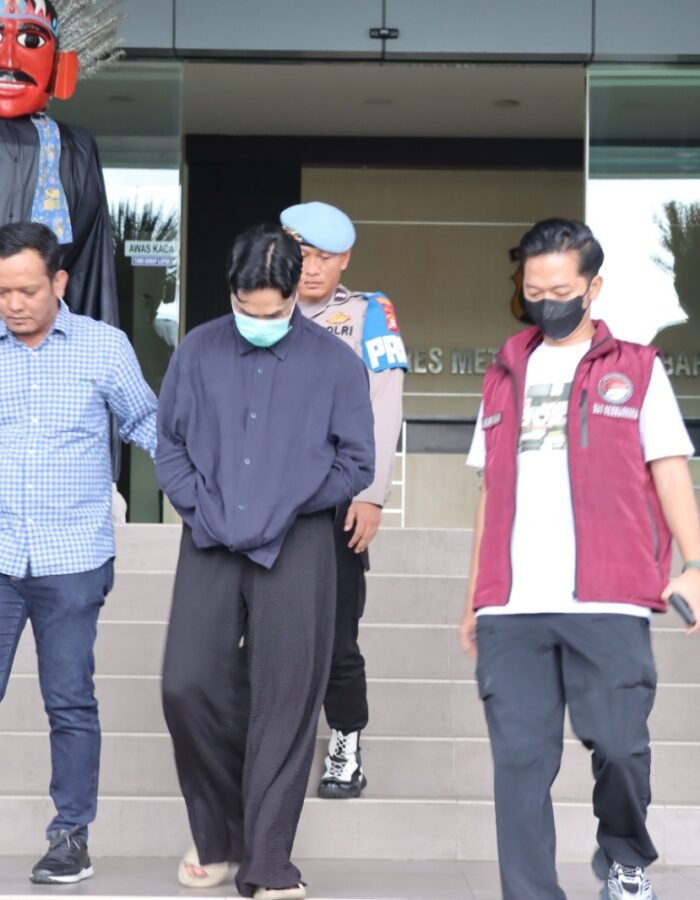Tampak terlihat OL mengenakan suiter biru dongker di kawal petugas menuju keruangan pemeriksaan kesehatan Si Dokkes Polres Metro Jakarta Barat