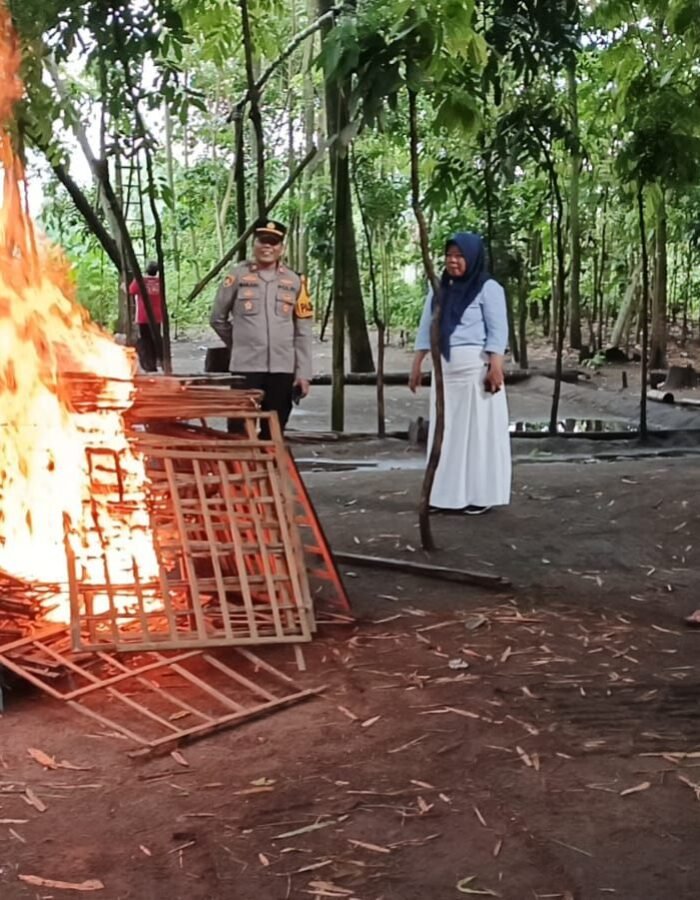 “Sarana diduga sebagai perjudian sabung ayam kami bakar di lokasi seperti terpal, kurungan ayam, bak air, dan gayung,” terang Kapolsek Puncu.