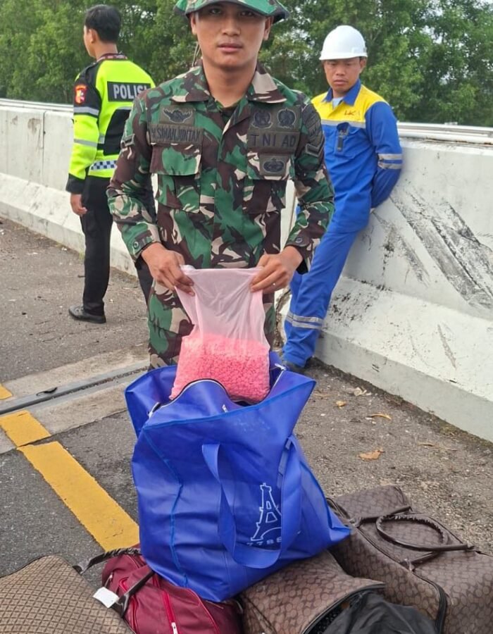 BATAVIAINEWS.COM Lampung, — Respons cepat dua prajurit Korem 043/Gatam dalam menindaklanjuti kecelakaan lalu lintas di Jalan Tol Trans Sumatra KM 136 jalur B, Kamis (20/11/2025), berhasil menggagalkan peredaran narkotika jenis ekstasi dalam jumlah besar.
