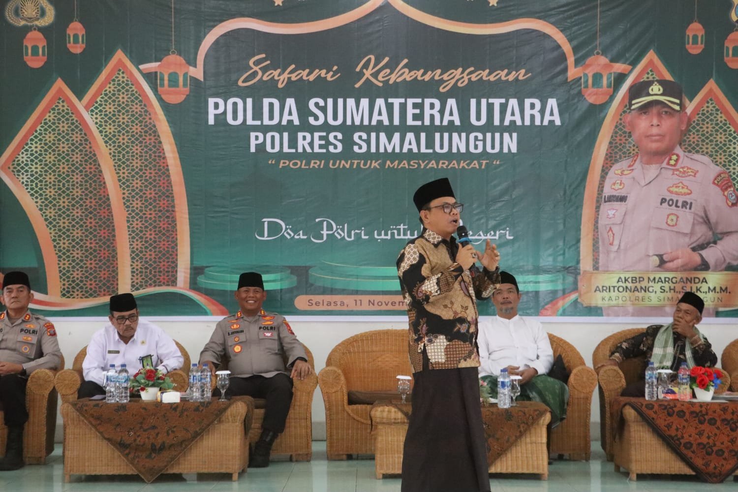 Dalam sambutannya, AKBP Marganda Aritonang menyampaikan apresiasi kepada Tim Safari Kebangsaan Polda Sumut yang telah berkunjung ke wilayah Simalungun. “Pertama kami ucapkan selamat datang kepada Tim Safari Kebangsaan Polda Sumut, Bapak AKBP Hartono, S.H., M.H., Tim Penceramah Bapak KH. Akhmad Khambali dan seluruh rombongan dari Polda Sumut, serta kepada seluruh undangan dari berbagai elemen masyarakat di Kabupaten Simalungun,” ucap Kapolres.